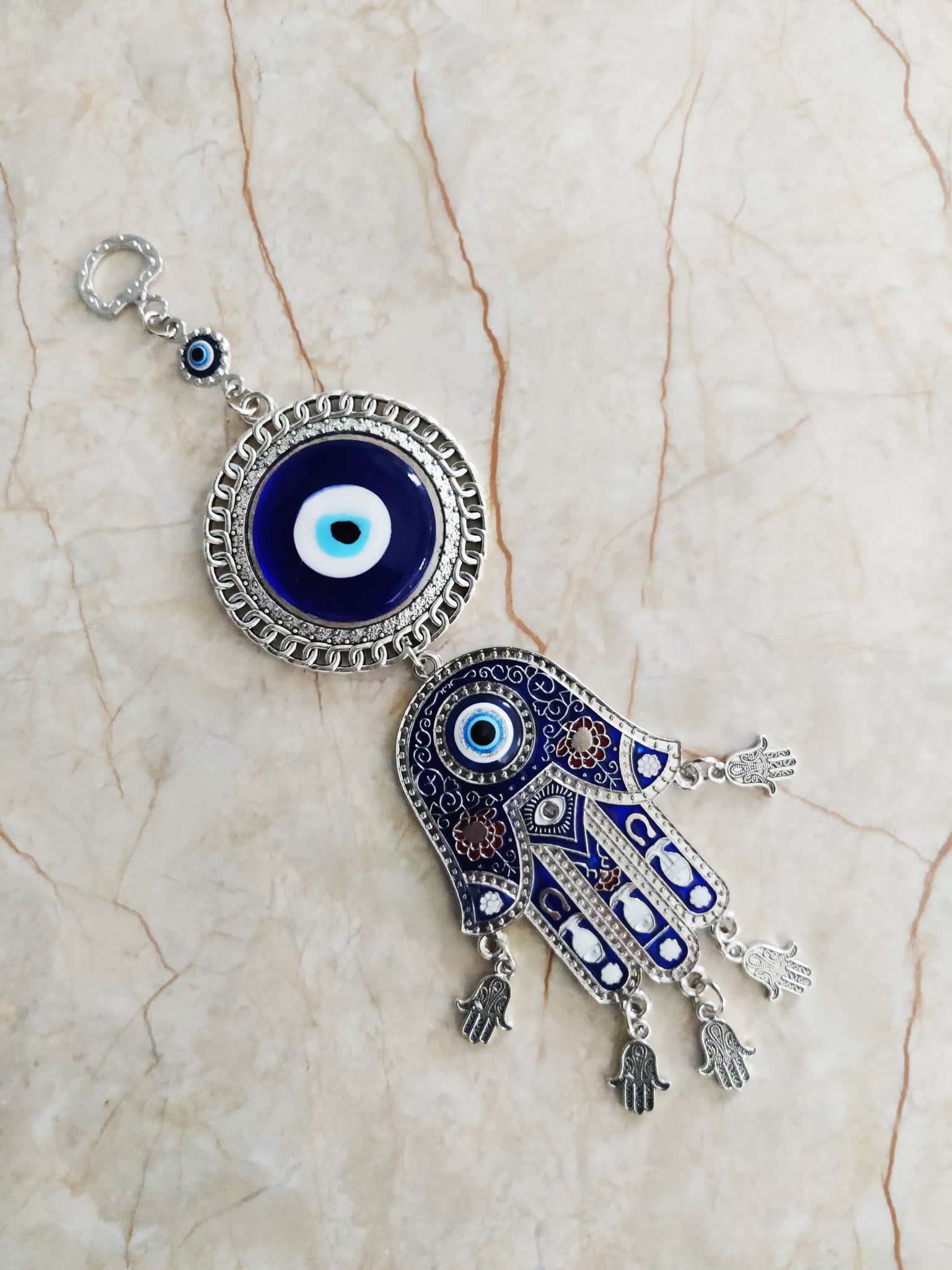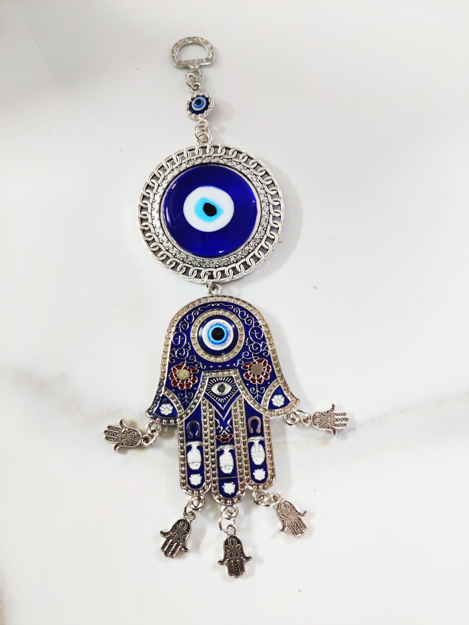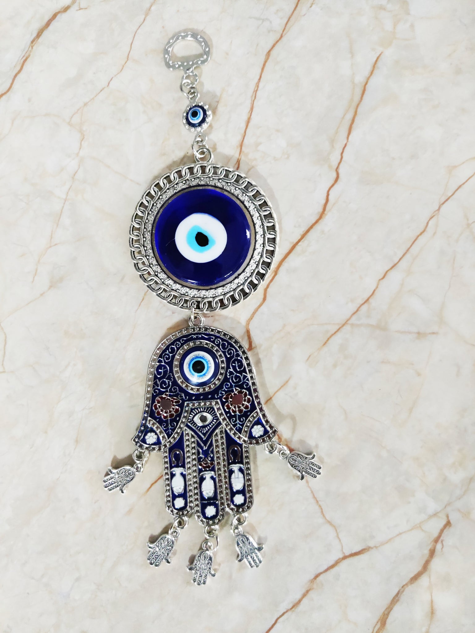 Attractive evil eye with Hamsa Hand hanging, it removes negative vibes, bad energies from your surroundings i.e home, office etc. It is good to place the evil eye hanging at your front door, window, above your working desk, of your home, office etc.