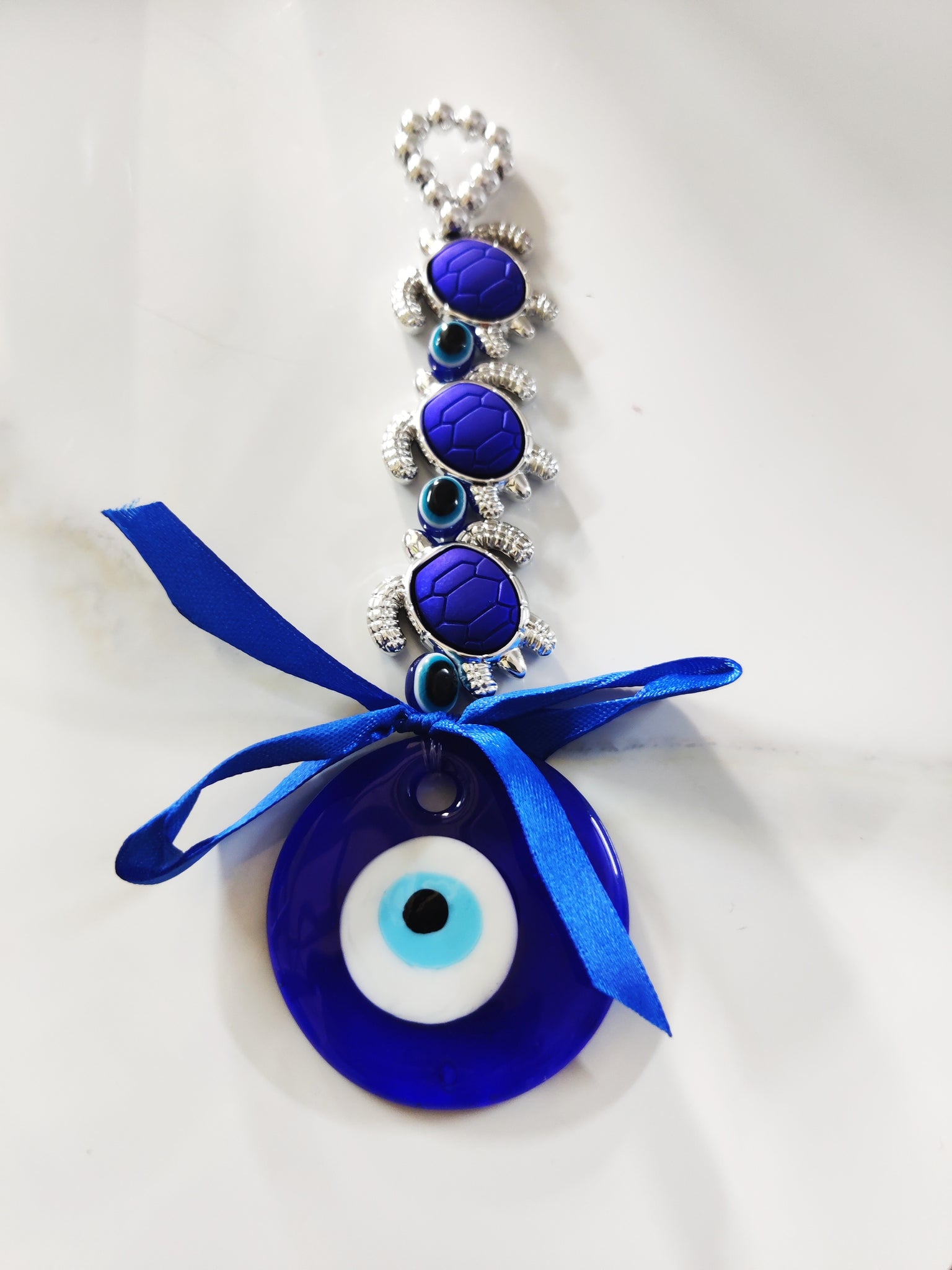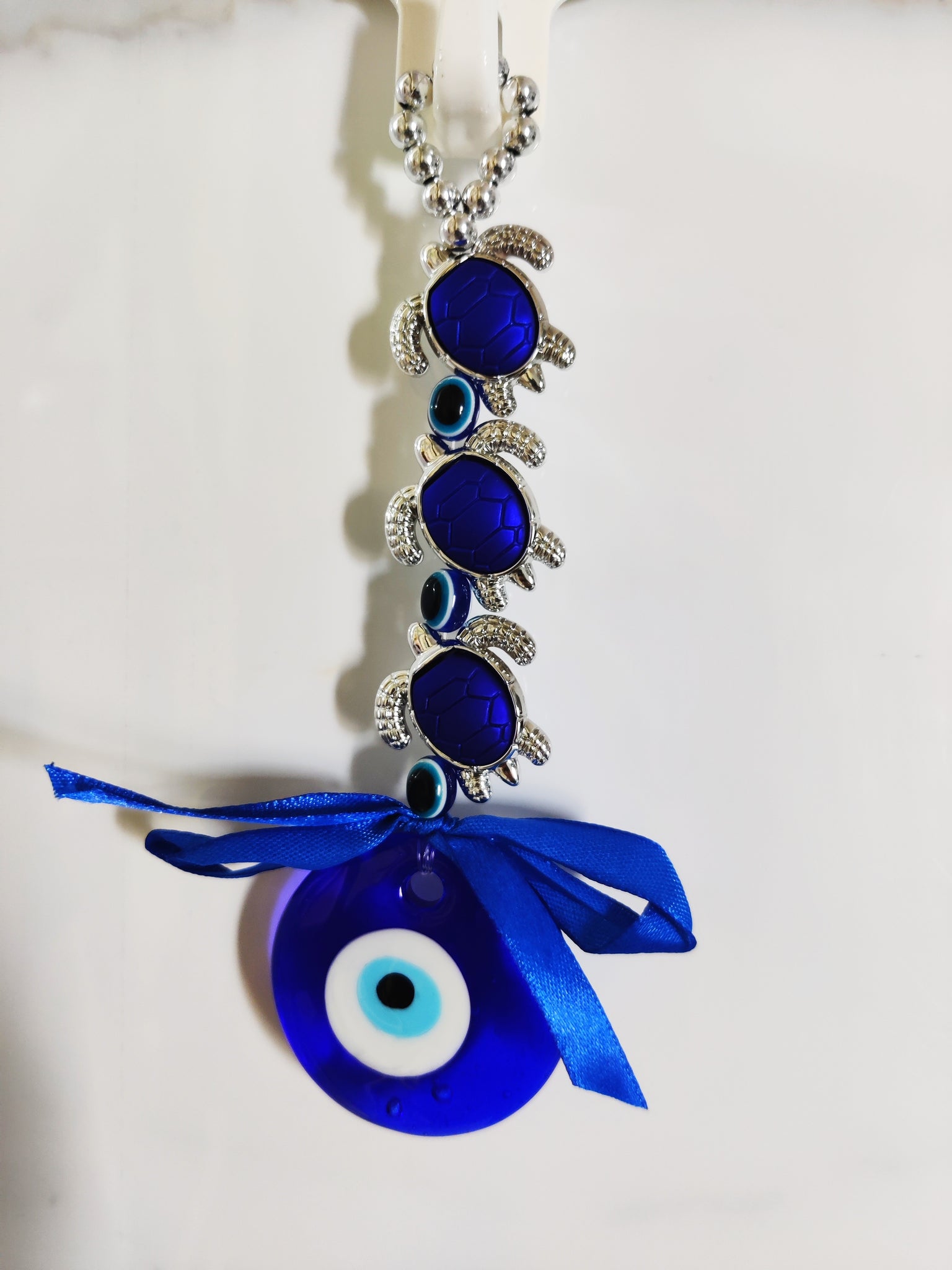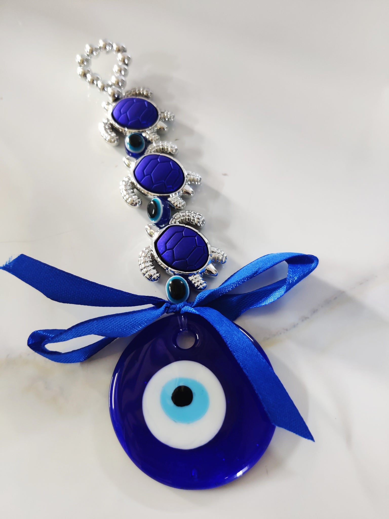 Evil Eye protection is a symbol of victory banner that originates from eastern regions of world and it protects you from against the harm caused by your jealous competitor, colleagues and helps your to get victory over them. Use this pretty turtle evil eye hanging for home decor, car hanging or key chain.