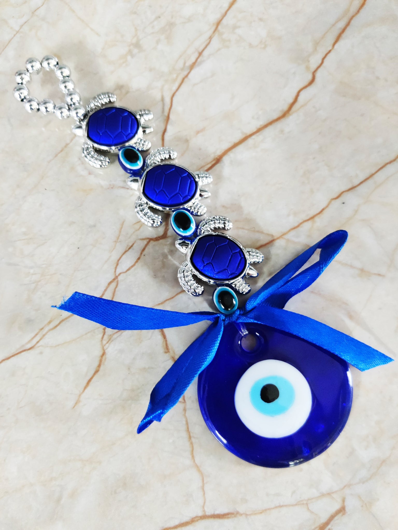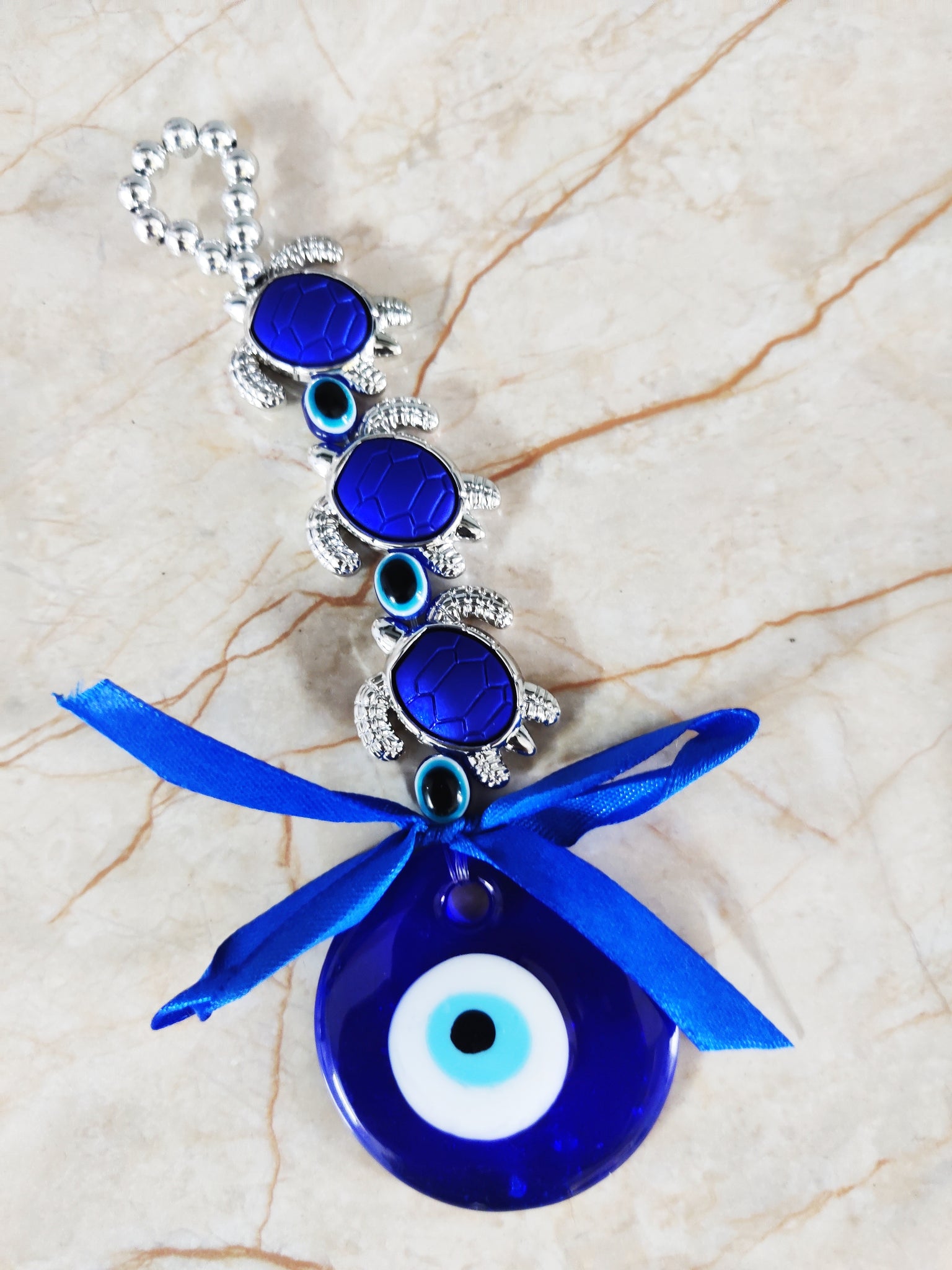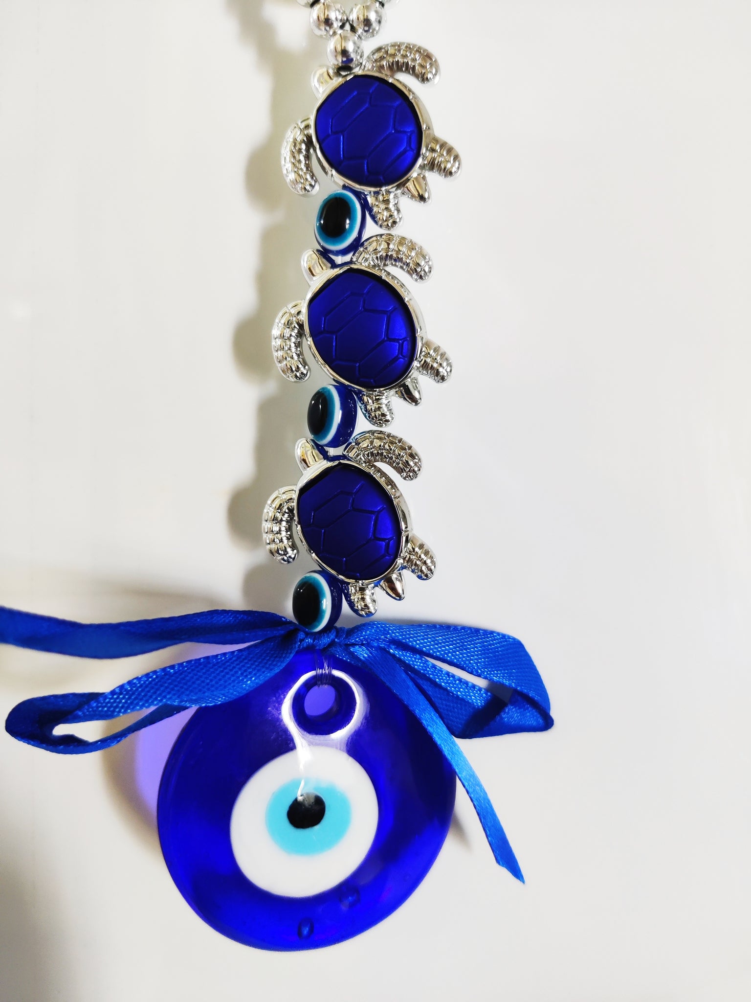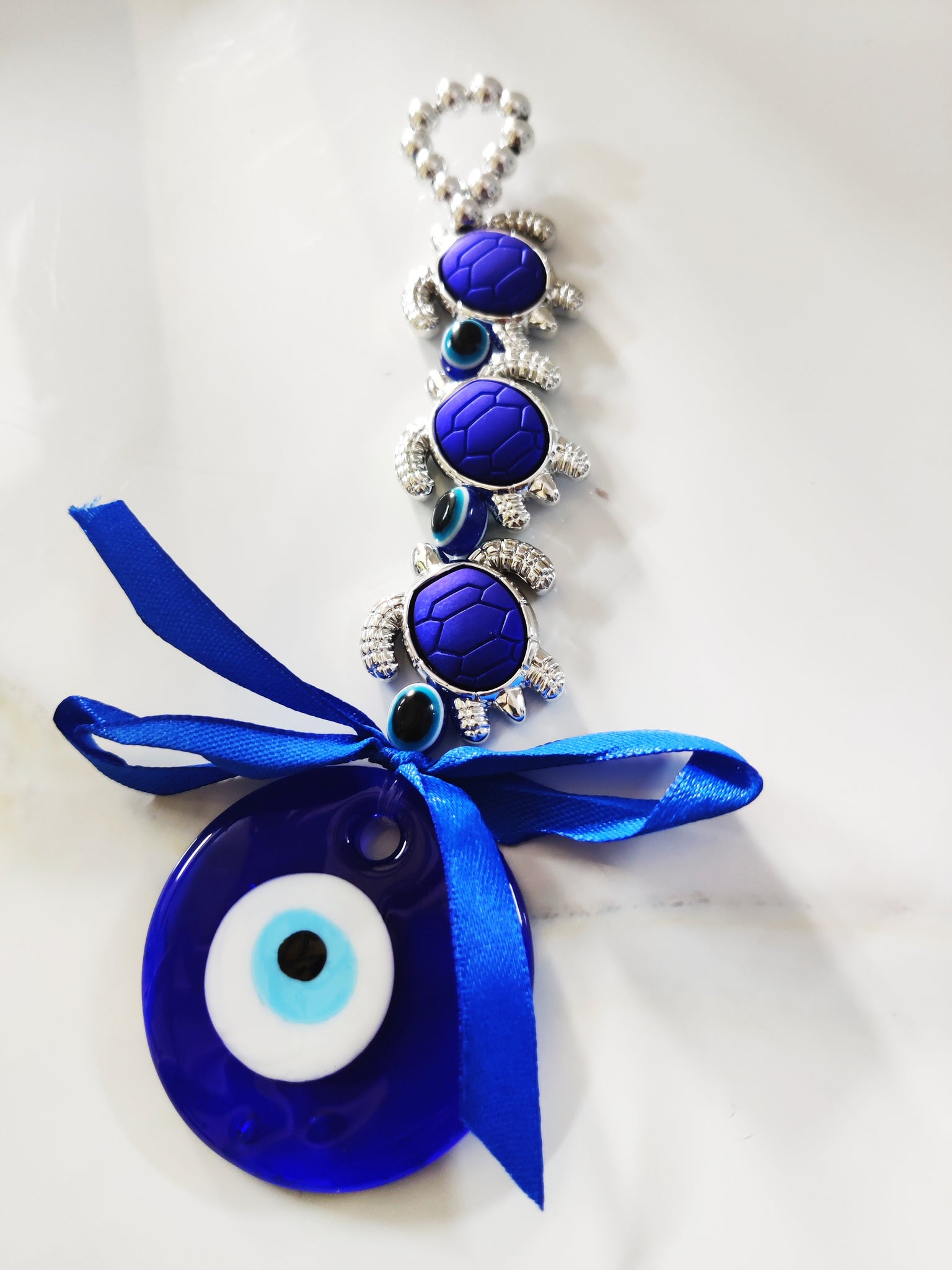 Evil Eye protection is a symbol of victory banner that originates from eastern regions of world and it protects you from against the harm caused by your jealous competitor, colleagues and helps your to get victory over them. Use this pretty turtle evil eye hanging for home decor, car hanging or key chain.